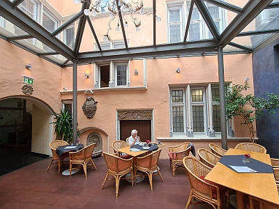 zu Bild 1: Der Treppenturm im Hof wurde im 2. Weltkrieg zwar beschädigt aber nicht zerstört. Die Überschrift über der ehemaligen Eingangstür zum Treppenturm lautet: