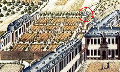 Das Gartenhaus rechts oben (im roten Kreis) steht heute noch an der Ecke Schöndorfer Straße / In der Reichsabtei. Außerdem waren vier kleinere und ein großer Springbrunnen in der Mitte vorhanden.