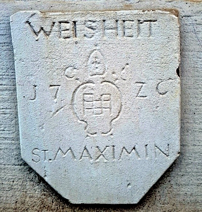 Auf einigen Sockeln, der heute im Palastgarten stehenden Skulpturen ist das Wappen des Abtes von Sankt Maximin, ein ovales Feld mit einem rost-förmigen Zeichen inmitten der Jahreszahl 1726 angebracht. Das Feld wird gekrönt vom Krummstab des Abtes, der Mitra und einem Schwertknauf. [Bild 6]