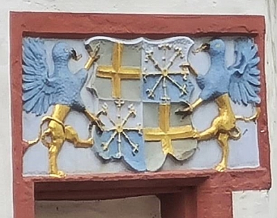 Neben dem Eingang im Innenhof ist noch das Wappen des Kurtrierischen Kanzlers Dr. Johann von Enschringen zu sehen.