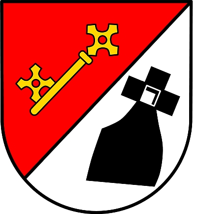 Blasonierung: "Schild schräggeteilt, vorne in Rot ein goldener Schlüssel, hinten in Silber ein schräg schwarzes Menhir-Kreuz."