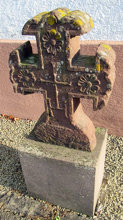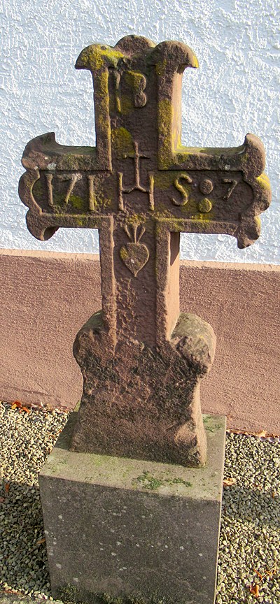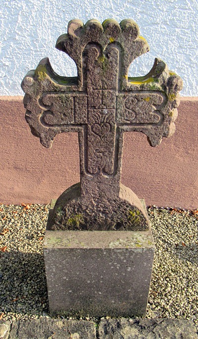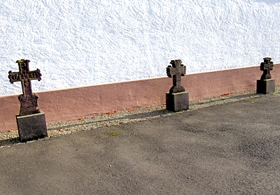 3 Pfarrergrabkreuze vor der nördlichen Aussenwand Kirche Sankt Nikolaus. Mit Ornamenten und IHS-Insignien versehen. [1]