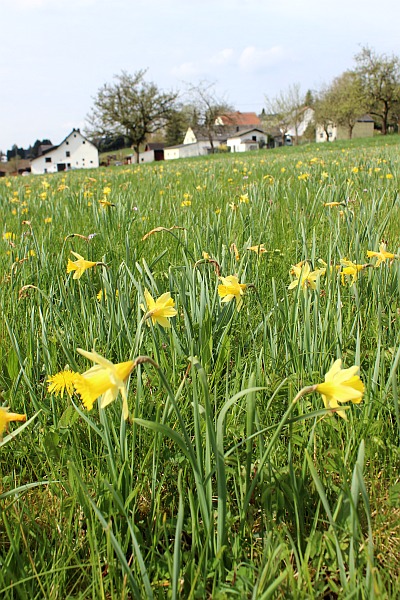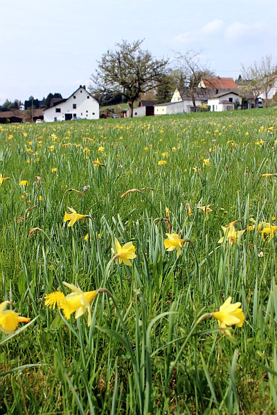 Mitte April bis Anfang Mai findet alljährlich in den Wiesen östlich von Thiergarten ein einmaliges Schauspiel statt. Die wild wachsende "Gelbe Narzisse" (Narcissus preudonarcissus) streckt sich tausendfach der Sonne entgegen und verwandelt die Wiesen im Nationalpark Hunsrück-Hochwald in gelbe Blütenteppiche. Die Frühlingsboten sehen ihren Gartenschwestern, den Osterglocken, zum Verwechseln ähnlich, sind nur etwas kleiner. [1]