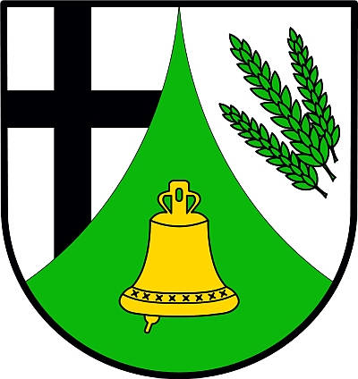Silber gespalten durch eine eingeschweifte grüne Spitze, darin eine goldene Glocke, vorn schwarzes durchgehendes Kreuz, hinten drei grüne Ähren.