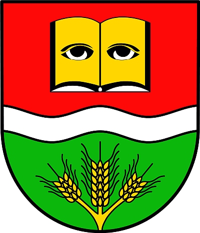 „Durch eine silberne Wellenleiste von Rot und Grün geteilt. Oben ein aufgeschlagenes goldenes Buch, jede der zwei sichtbaren Seiten belegt mit einem Auge: Wimpern schwarz, Hornhaut silbern, Iris schwarz. Unten drei fächerförmig angeordnete goldene Ähren“