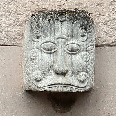 - Ein ganz einfaches Exemplar ist in der Giebelseite des gotischen Hauses "im Krahnen" [Ktahnenstraße 30/31 Red.] zu sehen, eine Mauervertiefung über dem Kellereingang. Die Maske daneben ist kein Schrotmaul, es fehlt ihr das wichtigste Kennzeichen, die Höhlung zur Aufnahme des Schrotbaums. [1]
