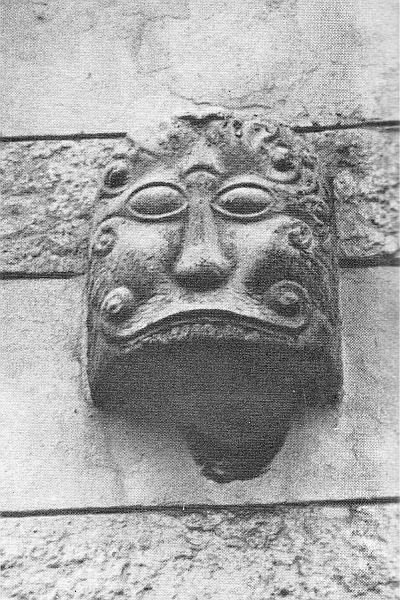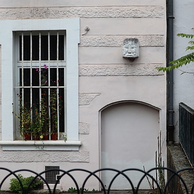 - Einmal am Hause Massard in der Jakobstraße. In die lange Front der Fenster ist auch der Kellereingang einbegriffen, und da die Keilsteine in den Fenstern eine barocke Zier haben, hat der Schlußstein des Kellereingangs dieses kunstvoll gehauene Schrotmaul.