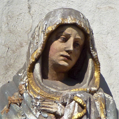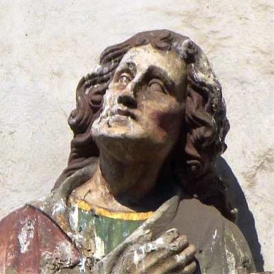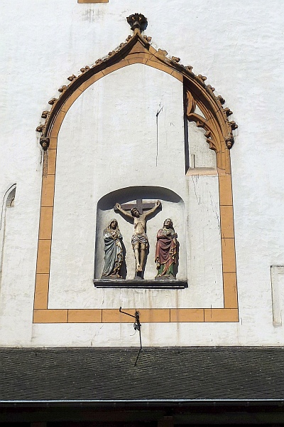 Aus dem 14. Jahrhundert stammende figürliche Darstellung der Kreuzigung Christi zusammen mit Mutter Maria und Jünger Johannes [1] in einem vermauerten Fenster von dem nur noch die mit Krabben besetzte Bekrönung im Eselsrückenbogen sichtbar ist. [2]