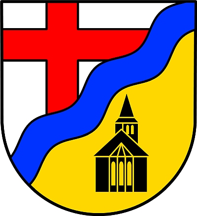 Wappenbegründung: Die Farbe Rot und das rote Kreuz stehen für die Zugehörigkeit zum Kurfürstentum Trier, der Wellenbalken symbolisiert den Fluss Nims, der den Ort durchfließt. Bereits 1346 wird der Kirche der heiligen Helena ein Ablass durch Papst Clemens VI. gewährt. [1]