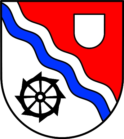 Blasonierung: „Von Rot über Silber geteilt durch blau-silbernen Wellenschrägbalken, vorn schwarzes Mühlrad, hinten silberner Schildchen.“
