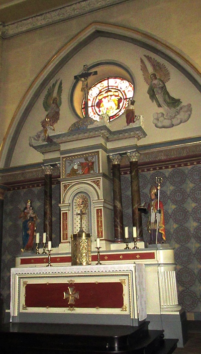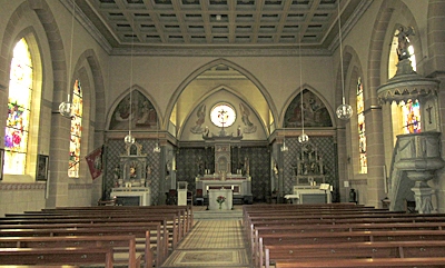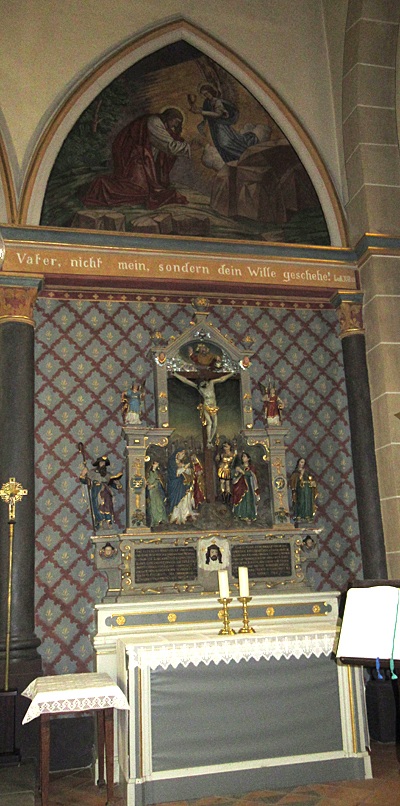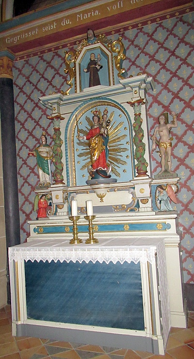Erbaut 1827-29. Altaraufsatz mit Kreuzigungsrelief, signiertes und datiertes Werk des Hans Ruprecht Hoffmann in Trier, von 1601. Sandsteinfigur eines Apostels aus dem 13. Jahrhundert. [1]