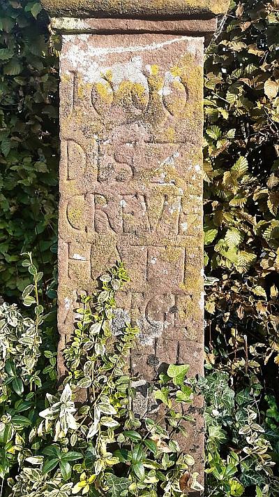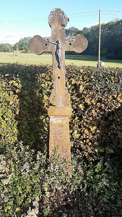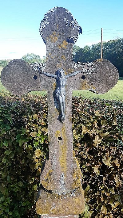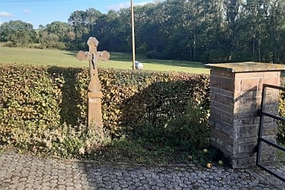 Obere, beschädigte Hälfte eines Schaftkreuzes von 1696, nach der Inschrift errichtet von PETER AETLDORFF. Neues Abschlußkreuz. Ursprünglicher Standort auf der östlichen Straßenseite und etwas oberhalb des jetzigen. [1]