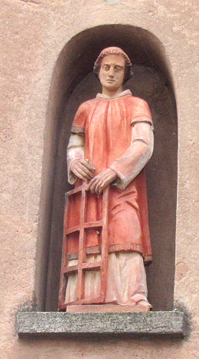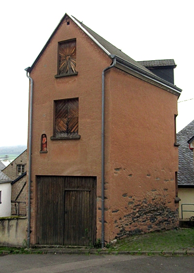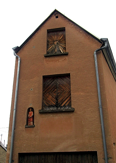 Schmales Wirtschaftsgebäude/Scheune mit Nischenfigur. [1]