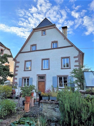 [...] Hochaufragender Baukörper zu zwei hohen Geschossen über Sockelung und zwei Geschosse einschließendem Dach. Das steil geneigte hohe Giebeldach ist an den Spitzen abgewalmt. Den in das Obergeschoß heruntergezogenen Giebel teilen Gesimse. Die gotischen Fenstereinfassungen mit Bogenblenden im Sturz haben sich hier erhalten. In den beiden Wohngeschossen wurden die Fensterrahmungen teilweise im 18. Jahrhundert erneuert.