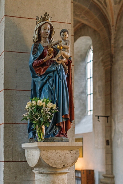 Eine stehende Madonna mit Kind, deren gotische Fassung nach dem Kriege wieder aufgedeckt wurde. [1]