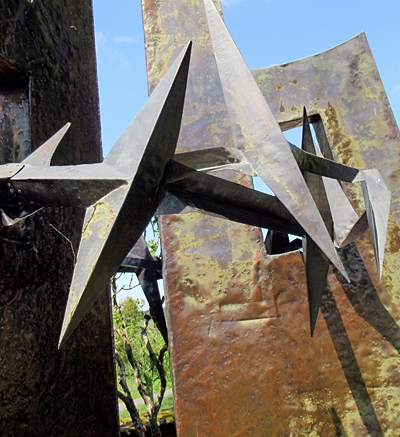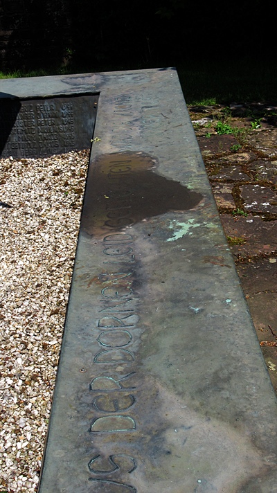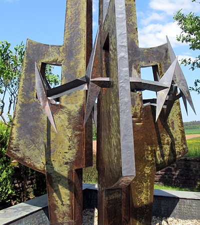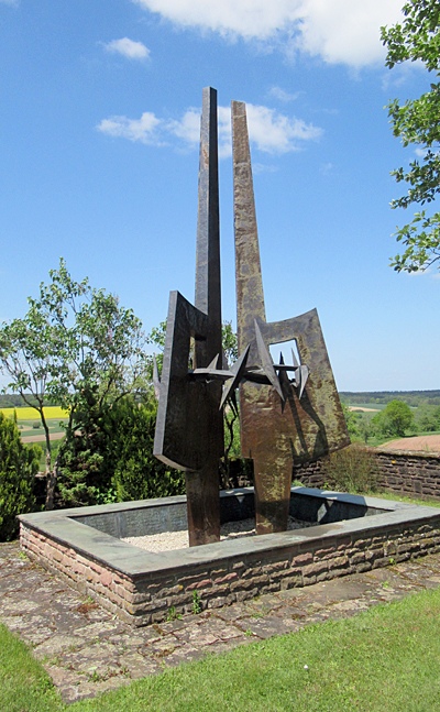 Kriegerehrenmal am Friedhof Orenhofen für die Gefallenen beider Weltkriege. Metallskulptur aus Kupferblech mit stilisiertem Dornenkranz in der Mitte. An der Mauerumrandung innen sind die Namen der Gefallenen eingraviert.