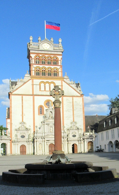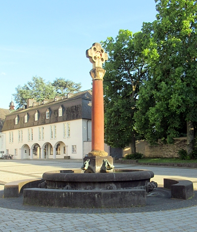 Pacellikreuz mit Brunnenanlage vor der Abteikirche Sankt Matthias. [1]