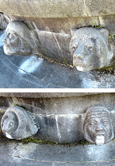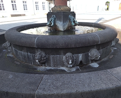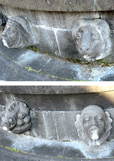 Darunter speien Köpfe von vier Landtieren, vier Wassertieren und vier Menschenwesen jede volle Stunde für einige Minuten frisches Wasser, das die Pilger einladen will, ihre müden Füße zu kühlen, bevor sie das letzte Stück des als Straße auf dem Platz markierten Weges gehen, der sie ans Ziel ihrer Wallfahrt führt: zum Grab des Apostels Matthias. [...] [2]