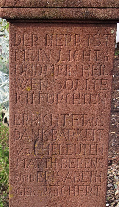 Das von den Eheleuten Matthias und Elisabeth Berens im Jahre 1943 aus massivem Stein errichtete Dankeskreuz trägt die Inschrift: [2]