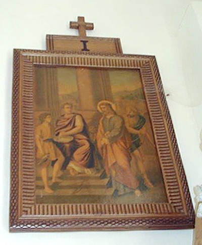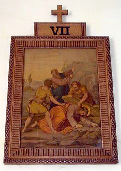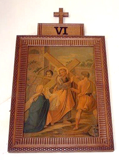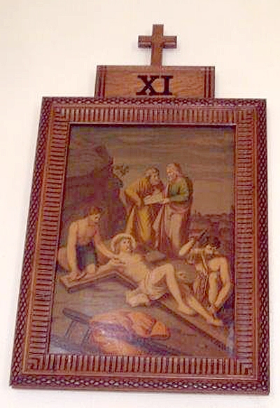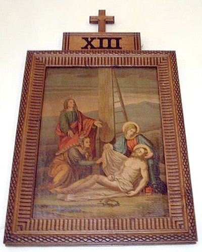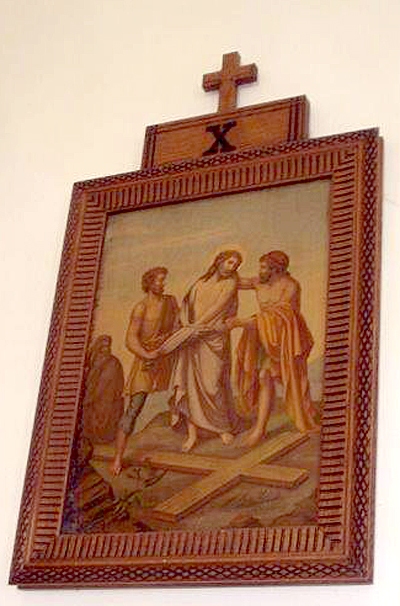Holzvertäfelte Kreuzwegstationen (Auswahl) in der Kirche Sankt Donatus. [1]