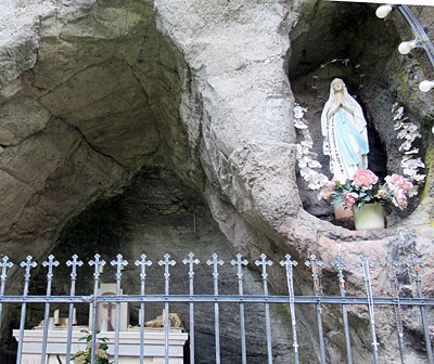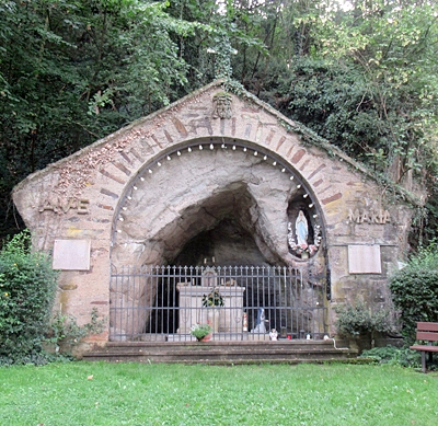 Mariengrotte neben dem Kloster Machern mit Marienstatue und Anbetungsaltar. An der Aussenmauer befinden sich 2 Gedenktafeln für die Gefallenen des 1. Weltkrieges.