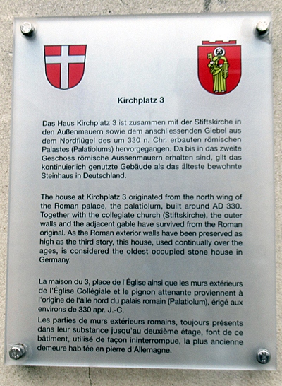 Das Haus Kirchplatz 3 ist zusammen mit der Stiftskirche in den Außenmauern sowie dem anschliessenden Giebel aus dem Nordflügel des um 300 n. Chr. erbauten römischen Palastes (Palatiolums) hervorgegangen. Da bis in das zweite Geschoss römische Aussenmauern erhalten sind, gilt das kontinuirlich genutzte Gebäude als das älteste bewohnte Steinhaus in Deutschland. [1]