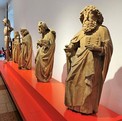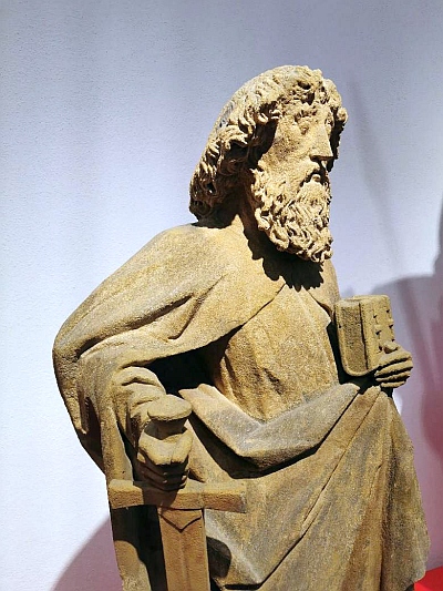Der Heilige Paulus gilt als Lehr-Apostel und wurde als Patron der 1473 gegründeten Universität von Trier gewählt - die Heiligenfiguren sind um 1483 entstanden, geschaffen vom Bildhauer „Meister Steffann“ für das Bürgerhaus der Stadt. Die STEIPE, direkt am Hauptmarkt gelegen, hatten die Bürger als Rathaus, Fest- und Empfangshaus 1430 erbaut und galt als Gegenpol der herrschenden kirchlichen Institution und bot selbstbewusst dem gegenüberliegenden Dom die Stirn. Dieses Gebäude wurde nach vollständiger Zerstörung durch den Krieg, 1970 originalgetreu wiederaufgebaut. Die geretteten Heiligenskulpturen, wie auch zwei 1,97m große Wächterfiguren in Rüstung, sind im Stadtmuseum aufbewahrt - es ist ein Schatz, diese mittelalterliche Bildhauerkunst hautnah erleben zu können. Es fällt in der Betrachtung auf, dass die Proportionen durch den zu großen Kopf im Verhältnis zur kleinen Körpergröße unstimmig wirken - tatsächlich hat der Bildhauermeister darauf geachtet, dass seine Figuren, die am Gebäude der Steipe zwischen den Spitzbogenarkaden in ca. 4m Höhe vorgesehen sind, je nach Perspektive realistisch wirken mussten. Dies kann man vor Ort am Hauptmarkt nachvollziehen und vergleichen. An der Ostfassade sind Skulpturenkopien angebracht und den mittelalterlichen Originalfarbtönen nachempfunden, jedoch überrascht die Wirkung der Farbenpracht. [Bilder 1 und 2] Wir sind in unserer heutigen Sehweise und Wahrnehmung mit den farblosen Steinfiguren vertrauter als mit der bunten Originaloptik. Sie wirken dadurch weniger würdevoll, puppenhaft, und passen doch im Gesamtkonzept zu dem Gebäude der spätgotischen Bauweise und zum Stadtzentrum.