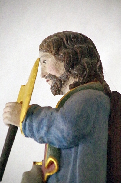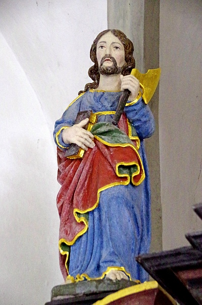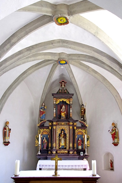 Der Apostelbalken am Triumphbogen, auf dem Jesus mit den zwölf Aposteln dargestellt ist, war früher im Seitenaltar als Pedrella eingebaut. Nach der 2005 erfolgten Restaurierung hängt er wieder nahe der Stelle, wo ihn seine Stifter im 14./15. Jahrhundert bereits positioniert hatten. [1]