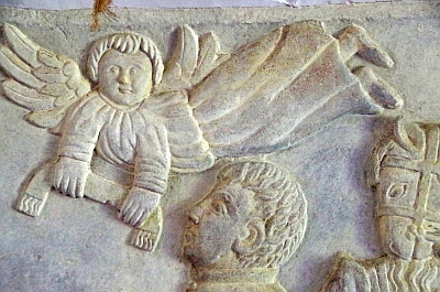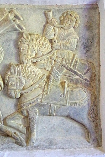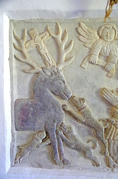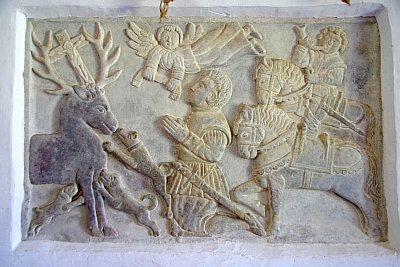 In der im 18. Jahrhundert hinzugefügten kleinen Sakristei befindet sich ein Steinrelief: Hubertus kniet vor dem Hirsch, der ein Kreuz im Geweih trägt. [1]