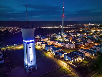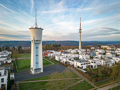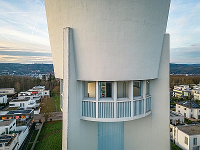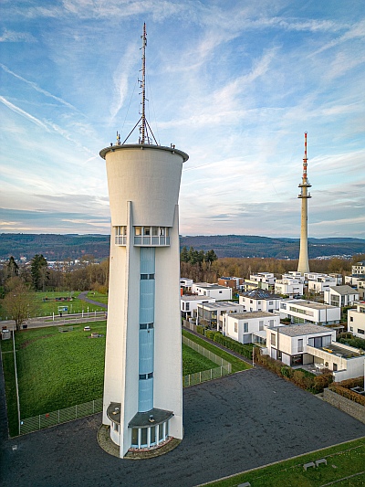 [...] wurde 1958 für eine optimale Wasserversorgung der Kasernenanlagen auf dem Petrisberg und der französischen Wohnsiedlung gebaut. Die elegante Konstruktion aus Beton, Stahl und Glas, die vom Architekt Herbert Montebaur geplant wurde, liegt geographisch gesehen mitten im Trierer Stadtgebiet.