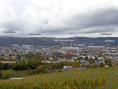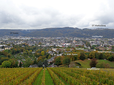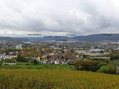 Hier haben wir eines der schönen Bilder vor uns, die sich, in der Umgebung Trier häufig bieten. Moselaufwärts liegt die breite Talebene offen vor uns. Im Hintergrunde geben die Höhen von Wasserliesch, Könen und Filzen einen Abschluß. Dort zeichnen sich auch die Umrisse der Kirche von Karthaus ab. In flachen Bogen windet sich die Mosel durch die breite Talfläche. Rechts drücken sich Zewen und Euren an den Pulsberg an, und vor uns, nahe unserem Standpunkt, dehnt sich der südliche Stadtteil aus. Die Matthias-Basilika mit den eigenartigen Turmbekrönungen zieht unsern Blick an. Die Brauerei Caspary könnte als eine Burg erscheinen; sie reiht sich recht gut in das Landschaftsbild ein.