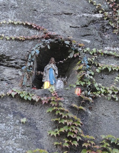 In einem Felsen, gegenüber den Häusern “ In Folz “ zwischen den, an einem Wirtschaftlichen Anwesen Nr. 9 und 14, in einer Felswand ausgehauenen Felsnische, eine stehende Madonnafigur.