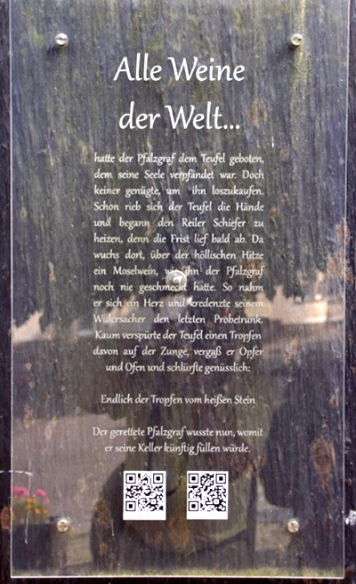 Alle Weine der Welt hatte der Pfalzgraf dem Teufel geboten, dem seine Seele verpfändet war. Keiner genügte, ihn loszukaufen. Schon rieb sich der Geschwänzte die Hände und begann den Reiler Schiefer zu heizen, denn die Frist mußte bald verstreichen. Da wuchs dort, von der höllischen Hitze geschürt, ein Moselwein, wie ihn der Pfalzgraf noch nie geschmeckt hatte. So nahm er sich ein Herz und kredenzte seinem Widersacher den letzten Probetrunk. Kaum verspürte der Zottige einen Tropfen davon auf der Zunge, vergaß er Opfer und Ofen und schmatzte laut: