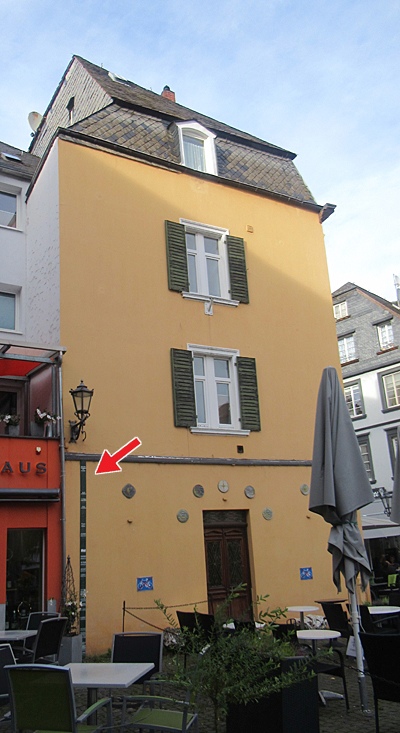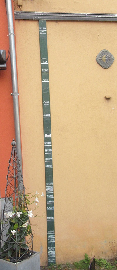 An der Fasssade dieses Hauses am Karlsbader Platz sind mehrere Markierungen mit historischen Hochwasserereignissen angebracht.