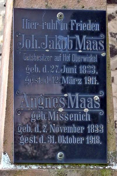 Der Familie gehörte das Hofgut Oberwinkel. Sie nahm damit eine gehobene Stellung ein. 230 Jahre lang waren die „Maas“ die Herren von Oberwinkel, zunächst ab 1686 als Hofmänner (Pächter) und von 1804 bis 1916 als Eigentümer. Was heute Oberwinkel genannt wird, war zu jener Zeit alles zum Hofgut gehörend mit Herrenhaus, riesigen Stallungen, Stallmeisterhof, Kutscherhof, Schweizerhof, Schäferhof und einer eigenen Hauskapelle. Dass eine solche Position über den Tellerrand des Winkeler Tales hinaus politische Weltoffenheit und Verantwortung für die wirtschaftliche Entwicklung der Heimat offerierte, belegt die Tatsache, dass Johann Jakob Maas einer der Gründungsväter des 1888 in Bad Bertrich gegründeten Eifelvereins war. [2]