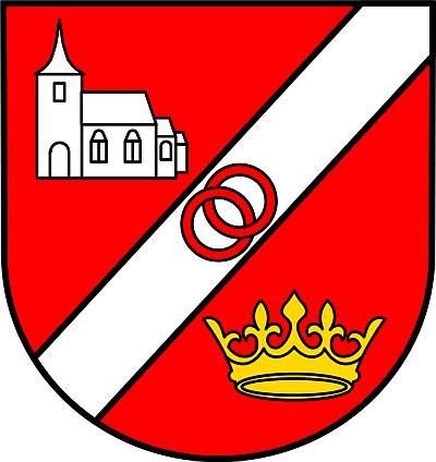 In Rot ein silberner Schräglinksbalken, belegt mit zwei ineinandergeschlungenen roten Ringen. Oben eine silberne Kirche im Umriss der ehemaligen Pfarrkirche. Unten eine goldene Krone.