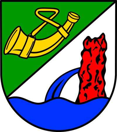 Über blauem Wellenschnitt-Schildfuß schräglinks von Grün über Silber geteilt, vorn ein goldenes Jagdhorn, hinten ein roter Steinbrunnen mit Wasserauslauf rechts.