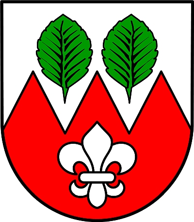 Blasonierung: „Von Silber über Rot durch drei flache Spitzen geteilt, oben zwei grüne Buchenblätter, unten eine silberne Lilie.“ [1]