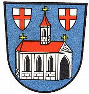 In Blau eine silberne Kirche mit rotem Dach und rot gedecktem Dachreiter; beiderseits desselben je ein schwebender silberner Schild mit durchgehendem rotem Kreuz.