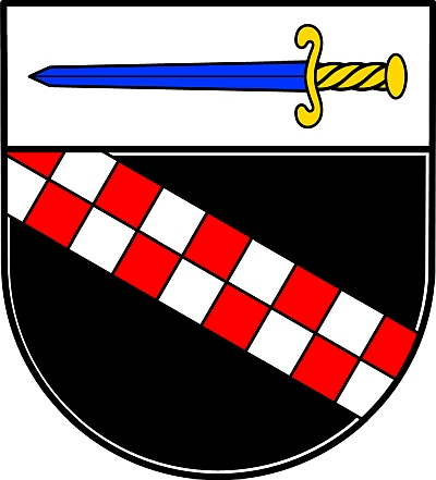 Unter silbernem Schildhaupt, darin ein blaues Schwert mit goldenem Griff, in Schwarz ein schrägrechter, rot-weiss geschachteter Balken.