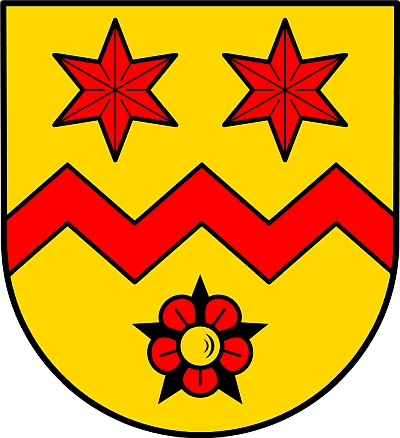 In Gold ein roter Sparrenbalken, begleitet oben von zwei roten sechsstrahligen Sternen, unten von einer roten Rose mit goldenem Butzen.