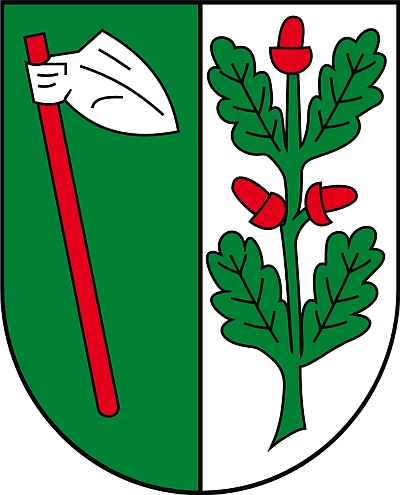 Der Rodehaken weist auf die Endsilbe des Ortsnamens, die grüne Farbe und der Eichenzweig auf Land- und Forstwirtschaft hin.