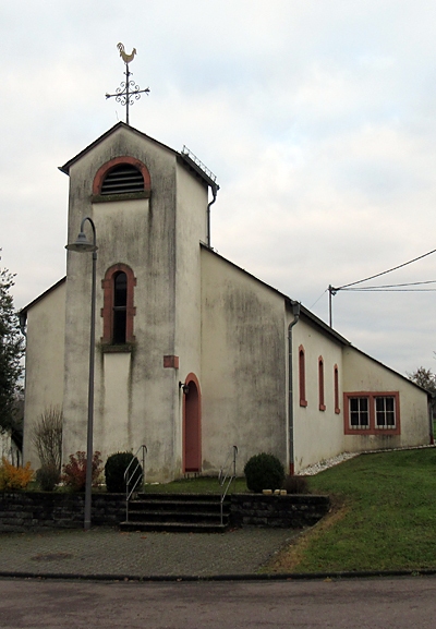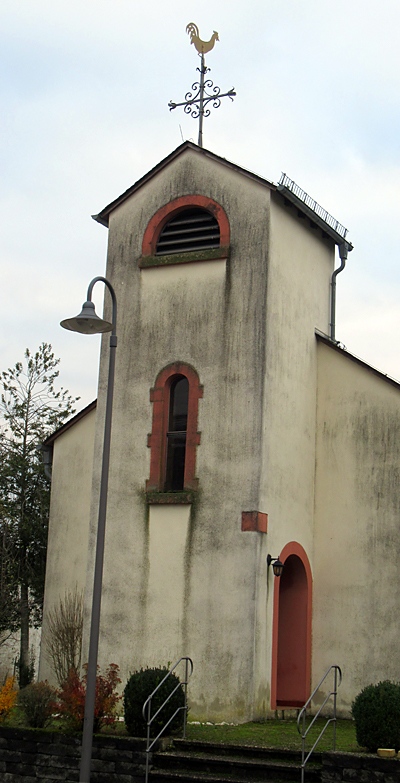 Am östlichen Rand anstelle eines Vorgängerbaues von 1792 nach Plänen von Peter Marx, Trier, 1932 / 33 neu erbaute Kirche.