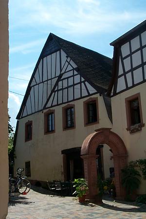 war im Schlussstein ein Fass mit den Anfangsbuchstaben A P C Bundesstraße ( = Peter Clerren und Anna Breit) und die Jahreszahl 1756. An der linken Hausecke steht ein gut erhaltenes Wegekreuz von 1756. Hinter dem Hauptbau befindet sich die frühere Ökonomie, ebenfalls ein Massivbau mit spitz zulaufendem Mansardendach, das im Giebelfeld Fachwerk besitzt. Aus der Anordnung des Gebälks ist zu ersehen, dass das Haus einmal aufgestockt wurde. Im Untergeschoss sieht man ein breites Scheunentor und ein recheckiges Fenster, im Obergeschoss drei Fenster mit flachgerundeten Bogen und Schlusssteinen. Es könnte sich um ein selbstständiges Wohnhaus gehandelt haben. [1]