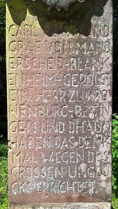 Aus Dankbarkeit gegen Gott ließ der Graf an der Stelle des Überfalles ein Kreuz errichten. Dieses Kreuz, heute Grafenkreuz im Volksmund Röppelskreuz genannt, steht etwa 200 m hinter der Büschkapelle. Der Volksname ist abgeleitet vom Namen des Eremiten "Röppel", der hier in unmittelbarer Nähe gelebt hat. Das neu restaurierte Kreuz trägt die Inschrift: "Karl-Ferdinand, Graf von Manderscheid, Blankenheim, Gerolstein. Herr zu Kronenburg, Bettingen und Daun haben das Denkmal wegen des großen Unglücks errichtet 1680". Die Räuber, unter denen sich auch ein Jardin aus Gees befand, wurden wegen dieser und anderer Mordtaten zum Tode veRuhrteilt und hingerichtet. Die Gerolsteiner Besitzungen fielen nach dem Tode von Graf Karl-Ferdinand an Blankenheim zurück. Erbe wurde Graf Salentin-Ernst von Manderscheid zu Blankenheim. [2]