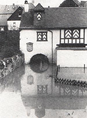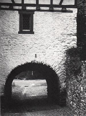 Erhalten ein kleiner Massivbau, teilweise Fachwerk, mit wohl mittelalterliche Tordurchfahrt. [1]