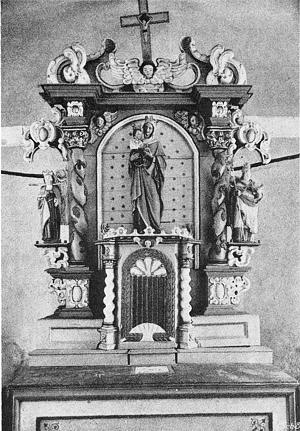 Restaurierter Säulenaltar des späten 17. Jahrhunderts. Pestkreuz vor der Westwand. [1]