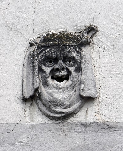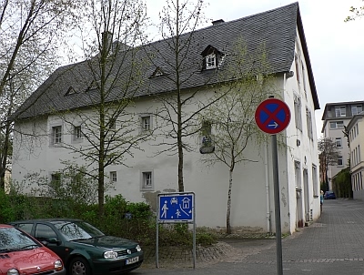 Die Giebelfassade bildet ein aus der Mittelachse gerücktes, stichbogig profiliertes Portal mit einem fratzenähnlichen Frauenkopf über dem Sturz aus. In der linken Achse ist der alte, mit einem Fenster überbaute, vermauerte Kellereingang erhalten. Seine Nutzung als Schrottreppe verrät ein ausgehöhlter Stein über dem Gewände, gegen den der Schrotbaum zum Ablassen und Hochziehen der Fässer angelehnt wurde. Im ersten Obergeschoß gekuppelte Fenster mit Blendmaßwerk, das linke mit dem