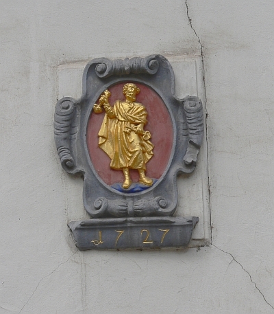 Stockgewände bewahrt. Das südliche, ursprünglich eine Tür-Fenster-Gruppe und heute zu einem Doppelfenster umgebaut, zeigt im ehem. Türsturz einen Anker, das Baudatum 1730 und die Initialen M(atthias) G(rell) -
