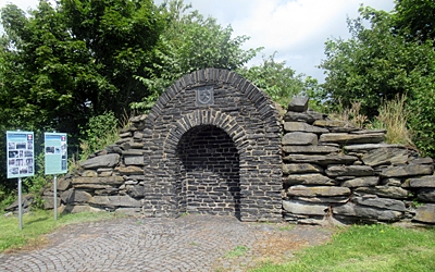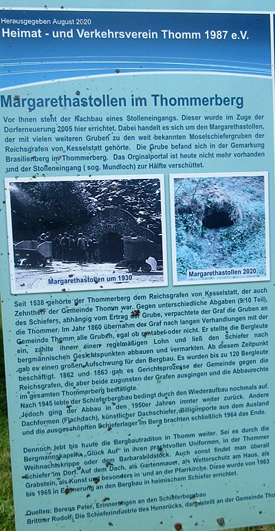 Nachbau eines Stolleneingangs, der Margarethastollen. Dieser Stollen gehörte zu den Mosellschiefergruben des Reichsgrafen von Kesselstatt. Die Grube befand sich in der Gemarkung Brasilienberg im Thommerberg. Das Originalportal ist heute nicht mehr vorhanden und der Stolleneingang (sogenanntes Mundloch) zur Hälfte verschüttet. [1]